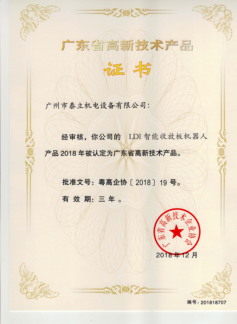 《LDI智能收放板機(jī)器人高新技術(shù)產(chǎn)品證書》