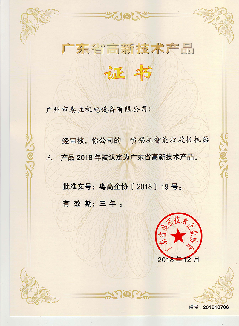 《噴錫機(jī)智能收放板機(jī)器人高新技術(shù)產(chǎn)品證書》