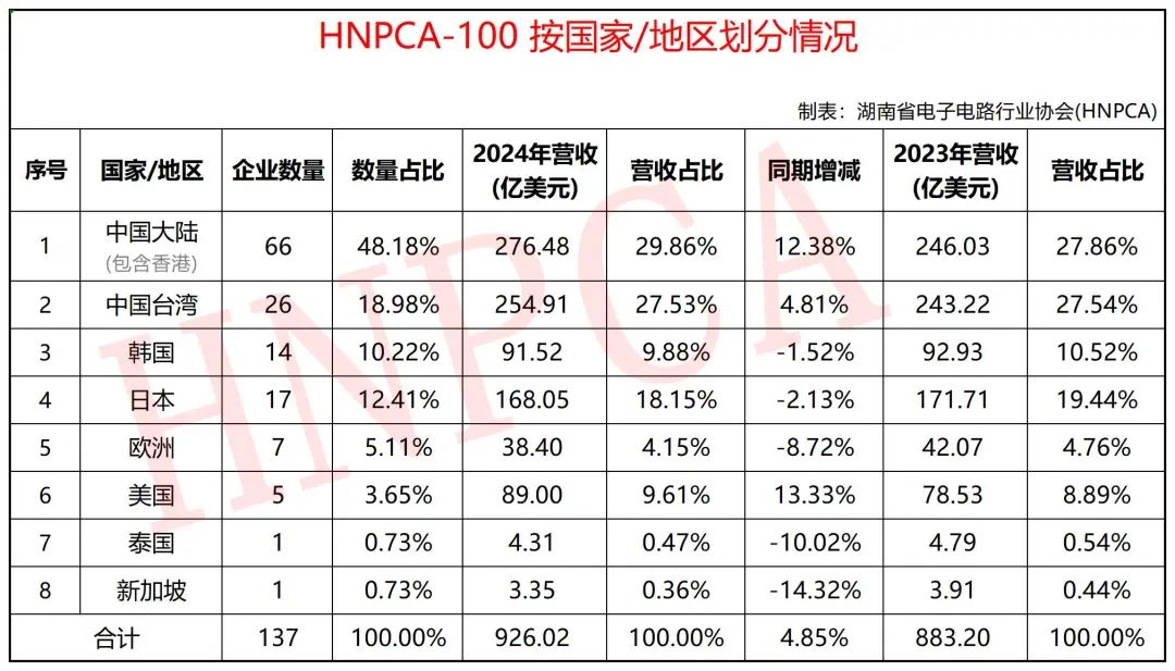 ①.中國大陸(含香港):66家,占比48.18%;總營收為276.48億美元,占比29.86%,同比增長12.38%;